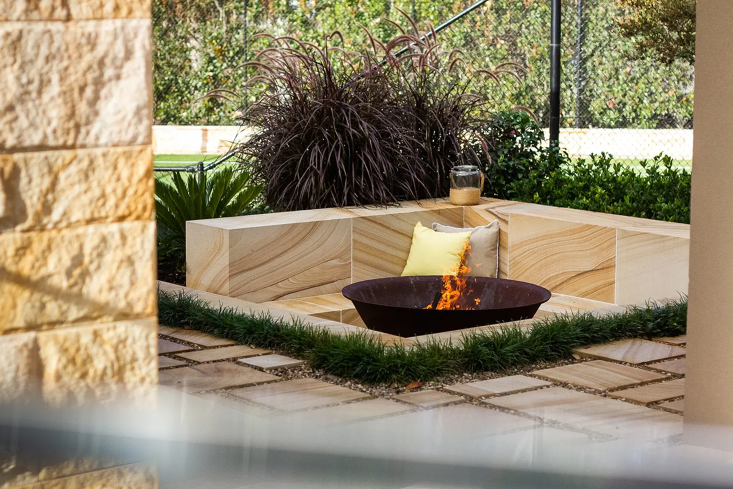 The material palette around a fire pit determines whether it feels architectural or temporary. Corten steel, with its rich patina, works beautifully in native or coastal gardens, blending with stone and grasses. Formed concrete suits contemporary designs where clean lines and texture define the aesthetic. Natural stone, however, remains timeless. It grounds the space and links the fire pit back to the home’s architecture.